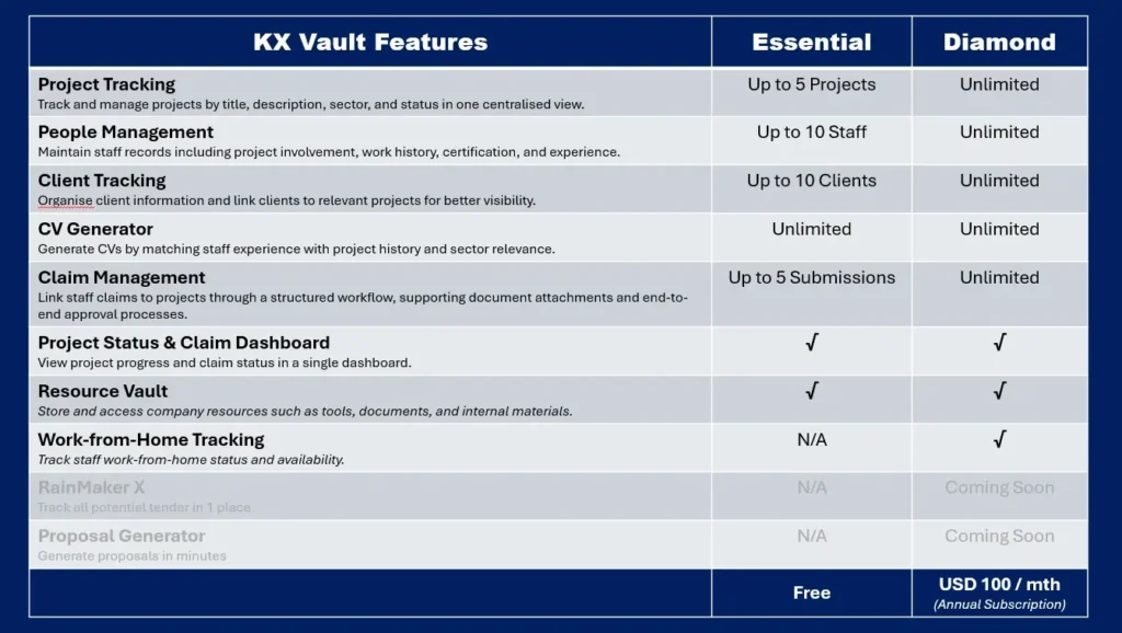 From project history to staff claims, kX Vault centralizes everything you need to build winning proposals — in minutes, not hours.
